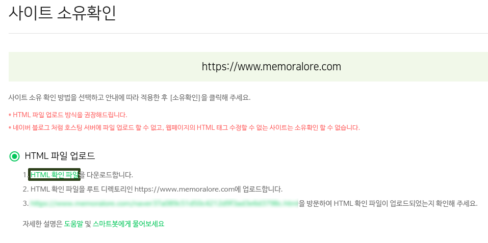 아무튼 그렇게 www.memoralore.com을 입력하면 아래와 같이 사이트 소유 확인이 보일 것이다.